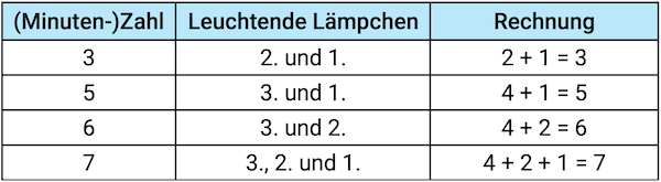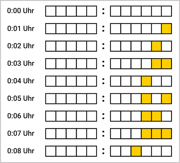 Hierbei kannst du bereits ein Muster erkennen. Bei Minute 1, 2, 4 und 8 leuchtet jeweils nur ein Lämpchen.