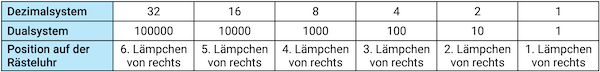 anschaust. Dafür eignet sich eine Tabelle. Die Position der Lämpchen wird dabei wieder von rechts