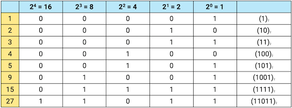 27 = 16 + 8 + 2 + 1 = 23 + 23 + 21 + 20 =