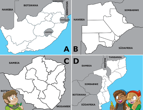 Gesagt, getan. Die drei Wichtel nehmen sich die Karten der Länder im Süden Afrikas (siehe Bild) und fangen an sie mit den Farben Gelb, Orange und Grün auszumalen. Doch schnell seufzt Agathe: „Ich glaube, mit unserer Strategie funktioniert das nicht. Hier brauchen wir eine vierte Farbe...”