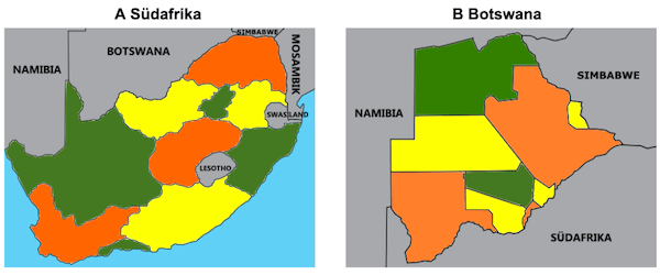 [Hinweis: Graue Flächen gehören zu einem anderen Land und werden nicht gefärbt. Das gilt insbesondere für Lesotho auf der Karte von Südafrika (Karte A). Zwei Regionen sind benachbart, wenn sie eine gemeinsame Grenze haben.]
