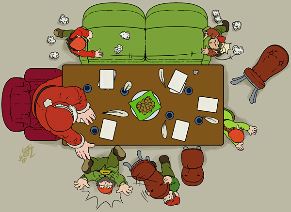 Der Weihnachtsmann sitzt wie jedes Jahr am linken Kopfende und Agathe auf dem Platz links neben ihm.