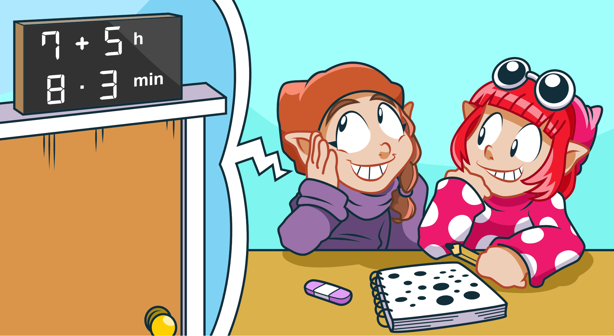 Wichtel Wiltrud und ihre beste Freundin Yayoi sitzen im Unterricht. Yayoi wartet schon sehnsüchtig auf die nächste Pause. Mit einem Stirnrunzeln schaut sie zu der neuen Uhr, die ihre Mathelehrerin erst an diesem Morgen über der Tür angebracht hat. Es ist eine digitale Uhr, die aber nicht einfach die Zeit anzeigt. Stattdessen wird für die Stunden eine kleine Additionsaufgabe und für die Minuten eine Multiplikationsaufgabe angezeigt.