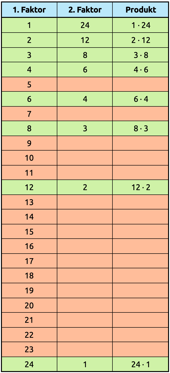 Wie viele verschiedene Möglichkeiten hat die Uhr, die Zahl 24 als Produkt zweier Zahlen darzustellen?